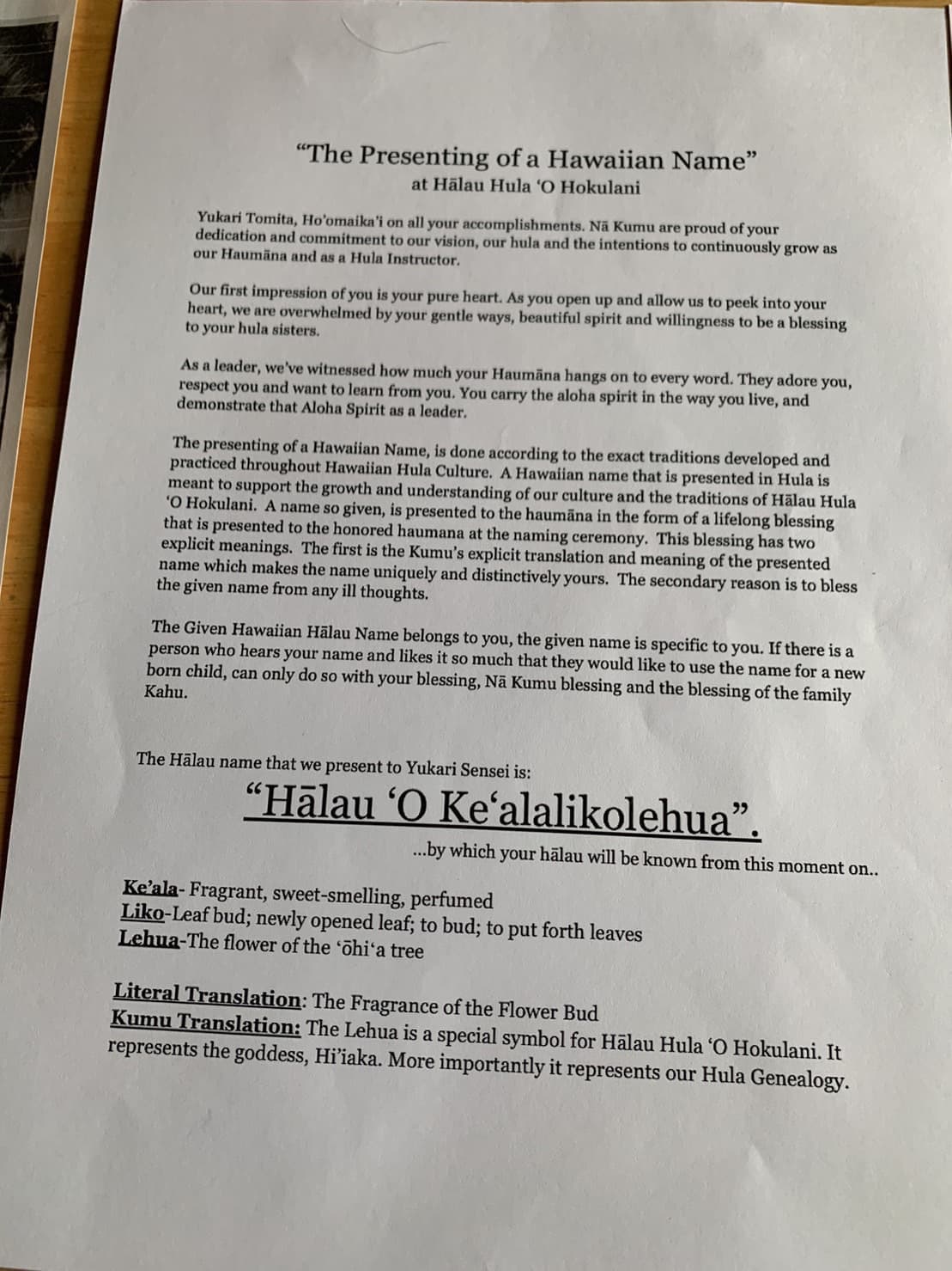 最終的に『フラを学ぶにはハワイに行くしかない』と決心、ハワイ島にあるHalau Hula O Hokulaniでハワイ文化、ハワイ語、歴史、フラを学び2023年9月に修了(ウニキ)。さらに継続的にHokulaniの日本でのサテライト組織の『KuuleiHoku』に所属し、日本中の仲間と共に、現在も継続的に学び続けている。